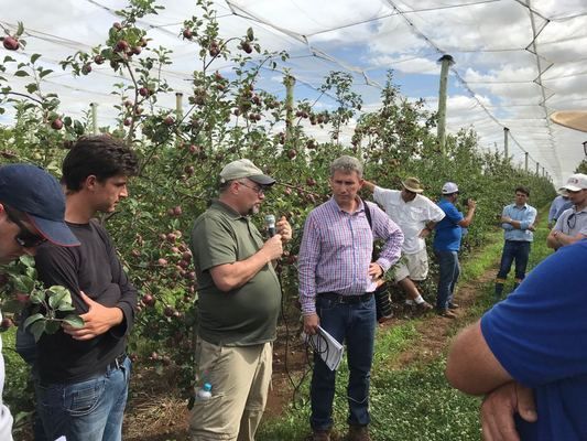 O grupo de Fruticultura da Universidade do Estado de Santa Catarina (CAV - UDESC), em conjunto com a Rasip Agropastoril, Agromillora e Proterra promoveram no dia 11 de janeirode 2018, no município de Vacaria-RS, o dia de campo sobre porta-enxertos da série Geneva® para a cultura da macieira no Sul do Brasil. O evento ocorreu nos pomares da empresa Rasip Agropastoril, sob coordenação do professor Dr. Leo Rufato da UDESC e do doutorando Tiago Afonso de Macedo, que foram acompanhados pelo pesquisador Gennaro Fazzio do Ministério da Agricultura dos Estados Unidos (USDA), junto a Universidade de Cornell.