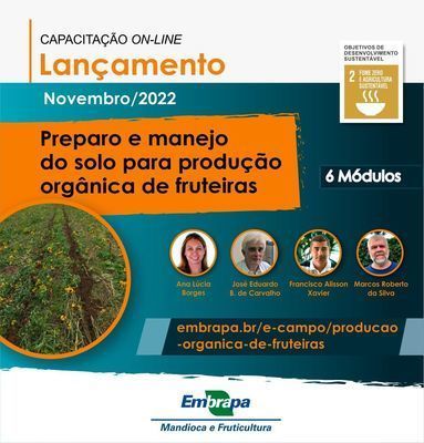 novo curso on-line gratuito do Ambiente Virtual de Aprendizagem da Embrapa, o e-Campo. "Preparo e manejo do solo para produção orgânica de fruteiras" tem como objetivo proporcionar aos participantes a aquisição de conhecimentos necessários ao correto preparo e manejo do solo em sistemas orgânicos de fruteiras tropicais.