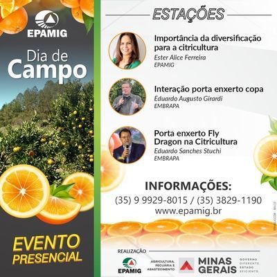 Mais informações sobre o Dia de Campo de citricultura da EPAMIG podem ser obtidas pelos números (35) 99929-8015 ou (35) 3829-1190. A empresa é vinculada à Secretaria de Agricultura, Pecuária e Abastecimento de Minas Gerais (Seapa). *Bruno Menezes Andrade Guimarães - Jornalista | Assessor de Comunicação - (31)3489-5023 - www.epamig.br