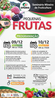 A Empresa de Pesquisa Agropecuária de Minas Gerais (EPAMIG) realiza nos dias 9 e 10 de dezembro, o Seminário Mineiro de Fruticultura com o tema Pequenas Frutas. O evento, totalmente online, será transmitido ao vivo pelo Canal Oficial da Empresa no Youtube, a partir das 16hs.
