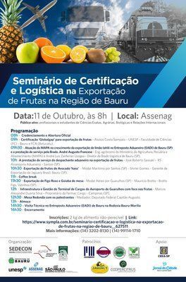 As palestras irão tratar de questões como certificação, atuação do MAPA, o papel do despachante aduaneiro, infraestrutura e alguns cases de sucesso na exportação de frutas. O professor da Unesp no câmpus de Bauru e Botucatu, Aloísio Costa Sampaio, irá abrir as atividades falando sobre a certificação Globalgap para exportação de frutas. Mais: Tel.: 14.3202-8130/99114-1710. Mais informações: https://www.sympla.com.br/seminario-certificacao-e-logistica-na-exportacao-de-frutas-na-regiao-de-bauru__627511