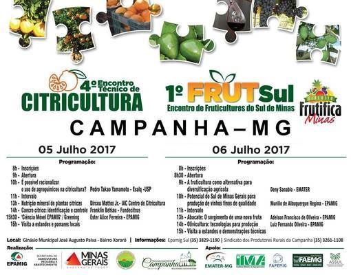 A Empresa de Pesquisa Agropecuária de Minas Gerais - EPAMIG -, em parceria com o Sindicato dos Produtores Rurais e a Prefeitura Municipal de Campanha, promove nos dias 5 e 6 de julho, eventos de fomento à fruticultura na região Sul do Estado. Além do Encontro Técnico de Citricultura, que chega a sua quarta edição, será realizado também o 1º Encontro de Fruticultores do Sul de Minas - FrutSul, que apresentará opções para a diversificação da atividade frutícola.