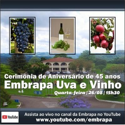 Ocorre na próxima quarta-feira, 26 de agosto, a cerimônia de aniversário dos 45 anos da Embrapa Uva e Vinho, uma das 43 unidades descentralizadas da Empresa Brasileira de Pesquisa Agropecuária, vinculada ao Ministério da Agricultura, Pecuária e Abastecimento. O evento terá início às 15h30min e será transmitido no canal da Embrapa no Youtube. Com a participação de Celso Moretti, presidente da Embrapa, a live será um momento de resgate das principais contribuições da unidade de pesquisa, contemplando a participação de diferentes atores das cadeias produtivas com as quais a ela interage. Na oportunidade também serão anunciadas novas parcerias e acontecerá o lançamento da página alusiva aos 45 anos e de um Brandy comemorativo.