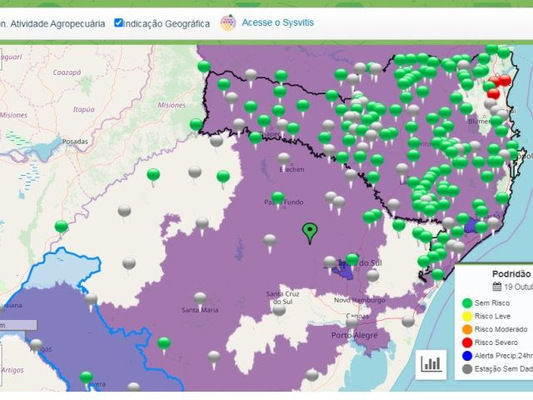 A Epagri/Ciram calcula a favorabilidade climática da ocorrência da podridão do cacho a partir de dados meteorológicos coletados pela rede de monitoramento hidrometeorológico operada por ela e por instituições parceiras. Os dados são constantemente atualizados no sistema Agroconnect.