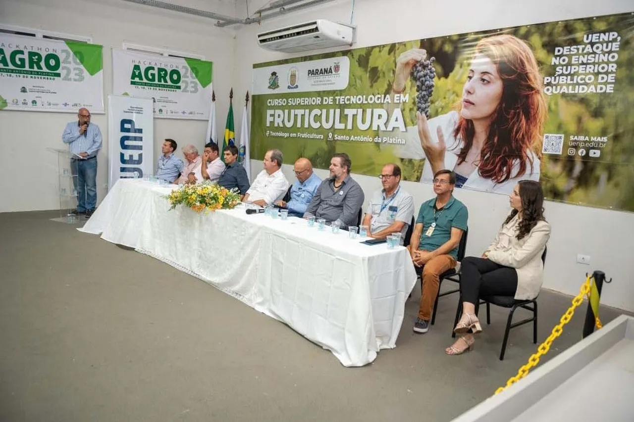 Presenças - O evento de lançamento do curso superior de Tecnologia em Fruticultura da UENP contou com a presença do prefeito de Santo Antônio da Platina, José da Silva Coelho Neto; do vice-reitor Ricardo Aparecido Campos; do deputado estadual Luiz Cláudio Romanelli, entre outras autoridades da universidade e de instituições públicas da região. *AEN - 19/05/2024