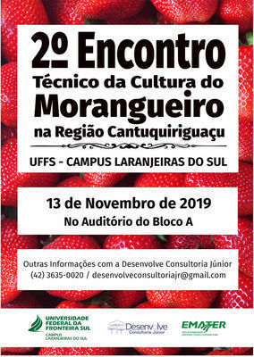 II Encontro Técnico da Cultura do Morangueiro na Região da Cantuquiriguaçu será realizado no dia 13 de Novembro de 2019, na UFFS-Campus Laranjeiras do Sul/PR, auditório do bloco A. Possui como parceiros a EMATER e CEAGRO. A programação consiste em palestras pela manhã e mini-cursos à tarde.