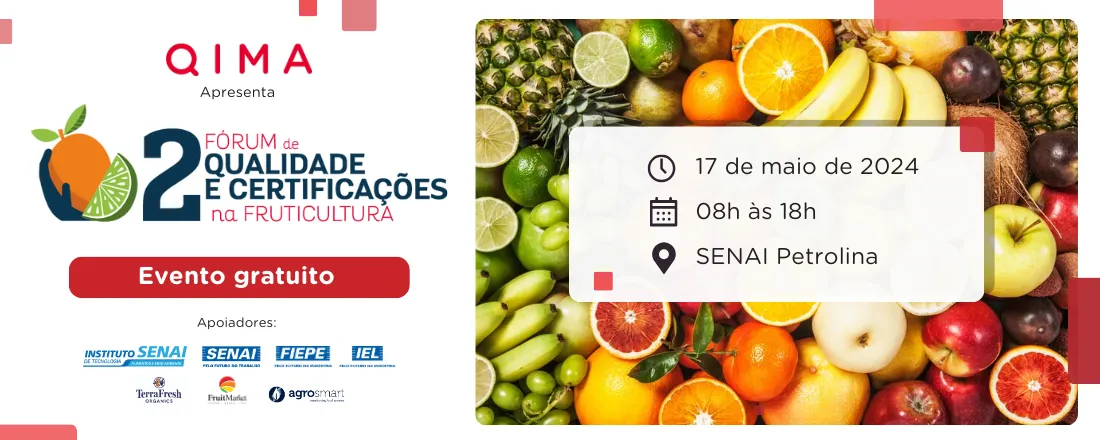 O II Fórum de Qualidade e Certificações na Fruticultura vai realizado no dia 17 de maio, das 08h às 18:30 no Senai, em Petrolina, Sertão de Pernambuco. As inscrições são gratuitas até o dia 10 de maio e podem ser realizadas através do link do evento. Reconhecendo a importância da fruticultura para o desenvolvimento do Vale do São Francisco, o objetivo é apoiar e impulsionar o setor na região.