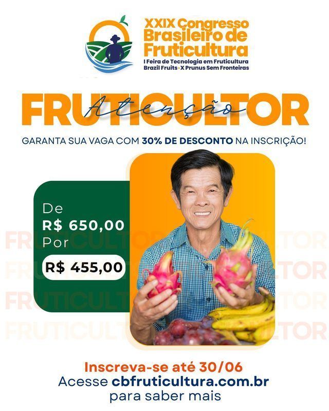 O lote promocional foi prorrogado até 30/06 - aproveite 20% de desconto para garantir sua vaga no 29º Congresso Brasileiro de Fruticultura!