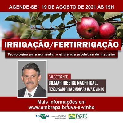 No próximo dia 19 de agosto, quinta-feira, a Embrapa Uva e Vinho promove a live "Irrigação e Fertirrigação: Tecnologias para aumentar a eficiência produtiva da macieira", com o pesquisador Gilmar Ribeiro Nachtigall, a partir das 19h, no canal da Embrapa no Youtube.