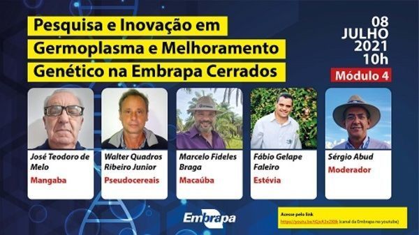 O quarto módulo do seminário "Pesquisa e Inovação em Germoplasma e Melhoramento Genético na Embrapa Cerrados" será realizado nesta quinta-feira (08), às 10h. Os assuntos abordados serão mangaba, pseudocereais, macaúba e estévia. Os interessados podem acompanhar por meio do canal da Embrapa no Youtube e da página da Embrapa Cerrados no Facebook.