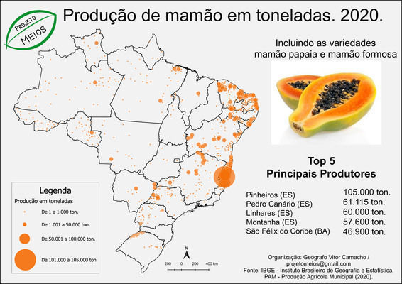 O Projeto Meios realizou o mapeamento do fruto utilizando dados da Produção Agrícola Municipal de 2020, do IBGE. No mapa é possível observar que o mamão é cultivado em todas as regiões do nosso país, vale ressaltar que os Estados do Ceará, Rio Grande do Norte e Minas Gerais se destacam na produção de mamão, contudo a principal região produtora é o extremo sul do Estado da Bahia e o norte do Estado do Espírito Santo.