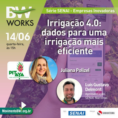 Nesta quarta-feira, dia 14 de junho, a partir das 15h, Juliana Polizel, cofundadora da Pitaya Irrigação, participará do BW Works SENAI - Empresas Inovadoras, uma iniciativa do Movimento BW, com o apoio do SENAI, para apresentar uma solução inovadora, criada em parceria com o Instituto SENAI de Tecnologia em Eletrônica e Automação. A tecnologia de irrigação é composta por sensores e aplicações em nuvem que monitoram o solo e acionam a irrigação quando necessário, promovendo o aumento da produtividade, menor consumo de água e redução no custo com energia. A solução pode ser acessada remotamente, garantindo a sua eficiência mesmo à distância