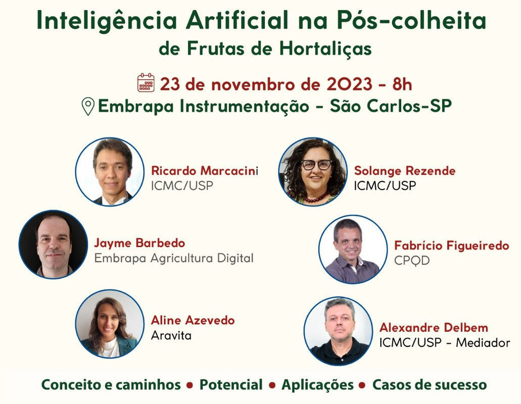 Os conceitos e caminhos da Inteligência Artificial serão apresentados pelos professores Ricardo Marcondes Marcacini e Solange de Oliveira Rezende, do Instituto de Ciências Matemáticas e de Computação da USP. O potencial da IA no Agro e na Pós-Colheita vai ser o tema do pesquisador Jayme Garcia Arnal Barbedo, da Embrapa Agricultura Digital (Campinas - SP).