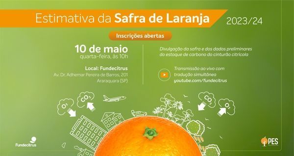 Estão abertas as inscrições para o evento da estimativa da safra de laranja 2023/24 e os dados preliminares do estoque de carbono do cinturão citrícola de São Paulo e Triângulo/Sudoeste Mineiro, que serão divulgados pelo Fundecitrus no dia 10 de maio.