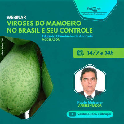 | As viroses, o maior entrave à implantação da cultura do mamoeiro, são o tema do webinar que a Embrapa Mandioca e Fruticultura (Cruz das Almas, BA), Unidade da Empresa Brasileira de Pesquisa Agropecuária - Embrapa, vinculada ao Ministério da Agricultura, Pecuária e Abastecimento, realiza nesta quarta-feira (14), no canal da Embrapa no YouTube. Direcionado ao setor produtivo, agentes de fiscalização agropecuária envolvidos com a cultura do mamoeiro e estudantes, o evento vai ser apresentado pelo pesquisador Paulo Ernesto Meissner Filho e moderado pelo pesquisador Eduardo Chumbinho de Andrade. O palestrante vai focar sua abordagem nos vírus da mancha anelar do mamoeiro (conhecido no Brasil como mosaico do mamoeiro), no vírus da meleira e no vírus do amarelo letal que são os mais importantes da cultura por conta da dificuldade do seu controle e da necessidade de migração que impõem aos produtores. Destaque será dado aos impactos econômicos causados, às principais estratégias de manejo utilizadas e ao que a pesquisa tem feito para oferecer novas ferramentas de manejo e controle das viroses que afetam o mamoeiro. O evento também vai ser transmitido para o facebook da Embrapa Mandioca e Fruticultura (facebook/ Serviço: *Léa Cunha - Embrapa Mandioca e Fruticultura |