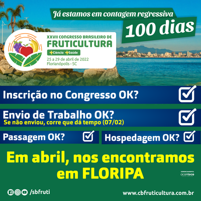 Inscrições - Garanta seu lugar no XXVII Congresso Brasileiro de Fruticultura: clique aqui e preencha o cadastro de participação. A programação está sendo preparada para ocorrer de forma presencial, seguindo os protocolos de biossegurança vigentes e orientados pelos órgãos estaduais. Mais: https://www.cbfruticultura.com.br
