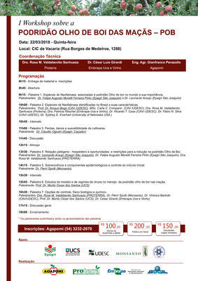 Desde 1999, quando foi identificada a sua ocorrência no Brasil, as instituições de pesquisa e ensino começaram a pesquisar as características do patógeno, a epidemiologia da doença e a definição de diversas táticas de manejo desta podridão. Buscando apoiar o setor produtivo no seu controle, a Embrapa Uva e Vinho, a Agapomi e a Proterra Engenharia Agronômica promovem, no dia 23 de agosto, o I Workshop sobre a Podridão Olho de Boi das Maçãs, no CIC de Vacaria-RS (Rua Borges de Medeiros, 1288). Segundo a pesquisadora Rosa Valdebenito Sanhueza, uma das coordenadoras do evento, no encontro, palestrantes de diferentes instituições de pesquisa irão apresentar pela 1ª vez o conjunto das informações obtidas nesses 18 anos de estudos, que deverá orientar técnicos e produtores de maçãs que atuam nos pomares, bem como os que trabalham na conservação da fruta. "A principal dificuldade para o manejo da doença, que também causa sintomas de morte de esporões e as vezes pequenos cancros nos galhos, reside no fato do patógeno estar presente nos ramos e gemas durante todo o ciclo da cultura e também nos frutos, independentemente das aplicações de fungicidas", complementa a especialista.