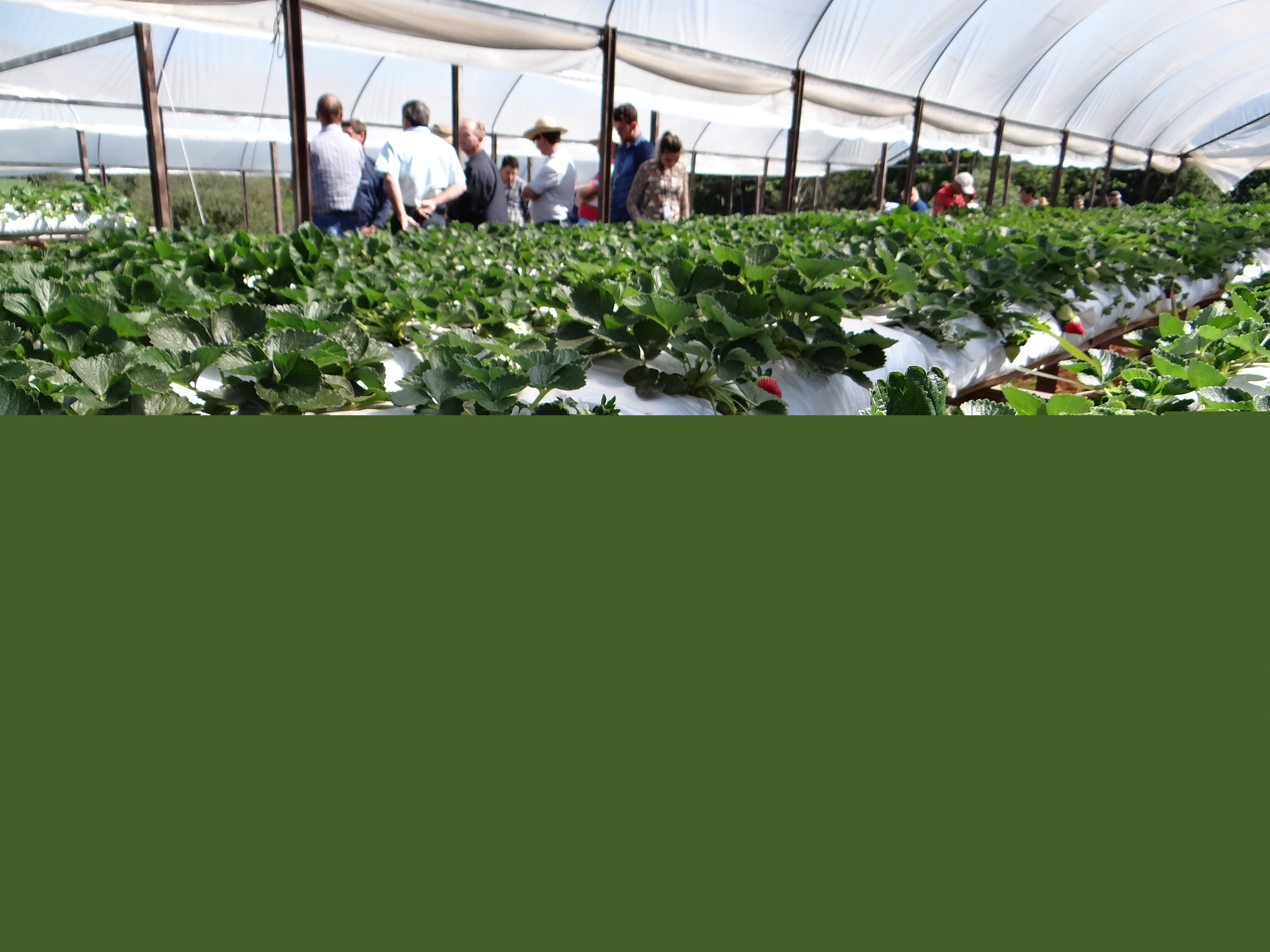 Visitas a campo - O grupo também conheceu experiências de produtores que investem na produção de morangos nos municípios de Santa Rosa e Tuparendi. Na comunidade de Guia Lopes, visitaram os produtores José Karling, Paulo Roberto Facchinello e Vanderlei José Karling, que por meio do Pronaf Investimento, com projeto elaborado pela Emater/RS-Ascar, implantaram uma estrutura de ferro e lona plástica, com 6.200 m2,, onde cultivam morangos em sistema semi-hidropônico.