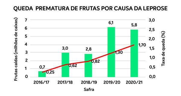 Tendo como um de seus efeitos a queda de frutos, principalmente quando as lesões estão próximas ao pedúnculo, a leprose influencia os números da safra. A taxa de queda de frutas provocada pela doença tem aumentado nos últimos cinco anos, conforme o gráfico abaixo, e chegou a 1,7% na safra 2020/2021.