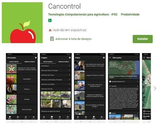 O aplicativo desenvolvido pela Epagri e IFSC para auxiliar técnicos e fruticultores na diagnose e monitoramento do cancro europeu já está disponível na PlayStore para aqueles que possuem celulares do tipo Android. Qualquer um pode baixar de forma gratuita o aplicativo em seus celulares, através da PlayStore digitando Cancontrol. Pedimos por gentileza que ajudem na divulgação do aplicativo para que mais pessoas utilizem a tecnologia e consequentemente tenhamos um acréscimo de controle da doença. Estamos trabalhando para em breve liberar esta mesma tecnologia para aqueles que utilizam a versão IOS em seus celulares.