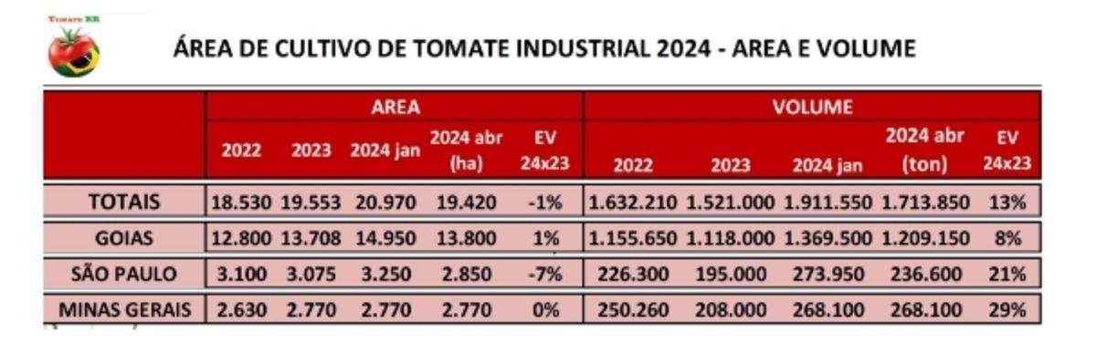 Segundo Vlamir Breternitz, diretor da Tomate BR, a área de cultivo deve ultrapassar 19 mil hectares, uma revisão das projeções divulgadas pela associação no início deste ano, quando se esperava um aumento de 7% do espaço ocupado pelas plantações. A produção deve alcançar em torno de 1,7 milhão de toneladas e os números das colheitas devem ficar bem próximos dos registrados em 2022, conforme mostra a projeção mais recente da entidade.