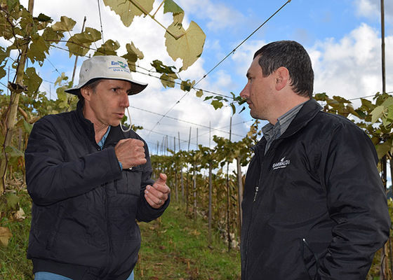 Evandro Bosa é gerente da Cooperativa Vinícola Garibaldi e tem como tarefa orientar 410 viticultores na Serra Gaúcha. Ele foi um dos técnicos parceiros do projeto e esteve presente durante toda a validação das recomendações da pesquisa. Na sua avaliação, os resultados foram tão positivos que, já durante a execução, muitas informações foram sendo repassadas para outros produtores. "Pelo menos 250 famílias associadas à cooperativa já estão colocando em prática as recomendações, cujos resultados nos novos vinhedos são fantásticos", avalia. Além das mudas, a cooperativa também adquire e repassa aos seus associados os insumos recomendados pela Embrapa.