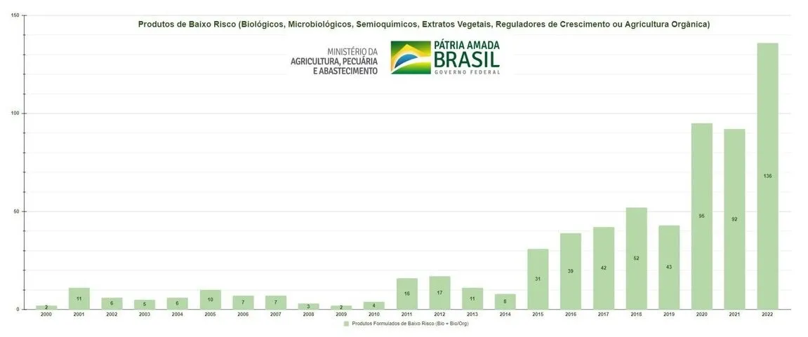 Com a publicação dos últimos produtos registrados no ano, o Brasil bate novamente o recorde de registros de defensivos de baixo impacto em 2022. "Neste ano, foram 136 novos produtos formulados registrados, entre eles estão 79 produtos com uso autorizado para a agricultura orgânica", ressalta a coordenadora-geral substituta de Agrotóxicos e Afins, Marina Dourado.