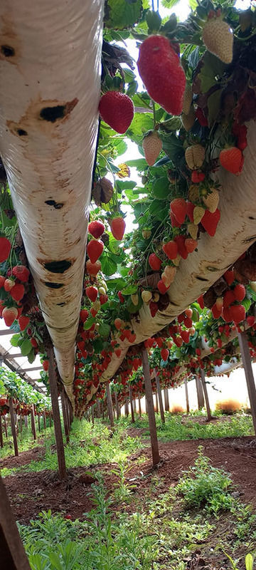 "Conhecemos a Fênix na safra 2022/23. Testamos a cultivar diretamente no sistema fora do solo em substrato que já vinha sendo usado desde 2020. Ela se desenvolveu bem, se destacou pelo pegamento e sobrevivência de 100% das mudas. O florescimento foi iniciado já em 45 dias após o plantio e as frutas, de tamanho grande e sabor diferenciado, permaneceram estáveis ao longo de toda a safra", contam os produtores.