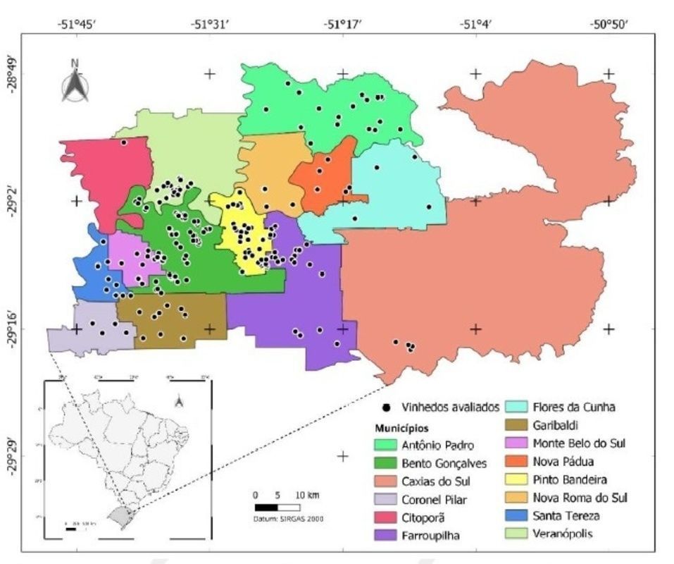 As amostragens foram realizadas nos municípios de Antônio Prado, Bento Gonçalves, Caxias do Sul, Coronel Pilar, Cotiporã, Farroupilha, Flores da Cunha, Garibaldi, Monte Belo do Sul, Nova Pádua, Pinto Bandeira, Nova Roma do Sul, Santa Tereza e Veranópolis,, áreas representativas da vitivinicultura regional. A repetição das coletas em diferentes pontos permitiu maior consistência nos resultados e uma aproximação mais fiel da realidade dos vinhedos da Serra.