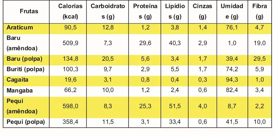 Os frutos do Cerrado possuem composição variada, tanto em termos calóricos quanto em concentração de macro e micronutrientes, e a escolha correta dos frutos pode contribuir para uma alimentação balanceada e rica em nutrientes, de apresentação gastronômica diversificada e agradável ao paladar do consumidor.