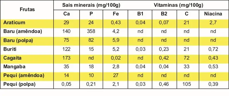 Informações a respeito da composição química (Tabela 1) e de vitaminas e minerais (Tabela 2) dos frutos do Cerrado são ferramentas básicas para a avaliação da forma de consumo, formulação de novos produtos, formas e métodos de processamento para agregar valor sem perder a qualidade nutricional e funcional.