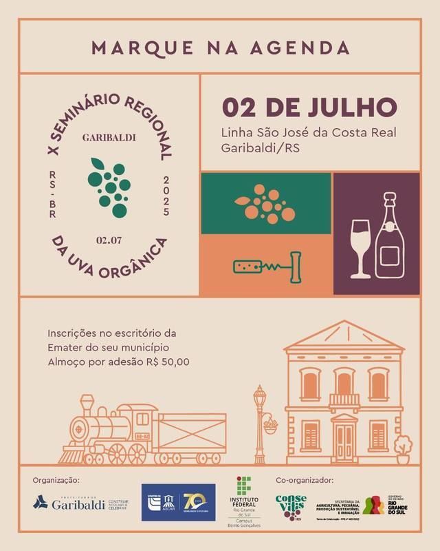 Temas pertinentes para os produtores de uva, tanto orgânica quanto convencional, serão abordados no 10º Seminário Regional da Uva Orgânica, que será realizado no dia 2 de julho, no salão de São José de Costa Real, em Garibaldi/RS. O objetivo é discutir as possibilidades de produção sustentável na viticultura, inclusive com a apresentação de tecnologias utilizadas na produção orgânica que se aplicam perfeitamente na produção convencional, além de promover a troca de experiências.