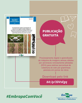 *CARVALHO, R. da S.; CARVALHO, J. E. B. de - Publication year: 2022 - Types of publication: Booklets - Unit: Embrapa Cassava & Fruits - Keywords: Agricultura, Agricultura de Precisão, Agriculture, Artificial intelligence, Citricultura, Citrus fruits, Cobertura Vegetal, Cobertura do Solo, Drone, Drums (equipment), Equipamento, Equipment, Fruta Cítrica, Ground cover plants, Inteligência artificial, Precision agriculture, Processamento digital, Tecnologia digital, Vegetation cover