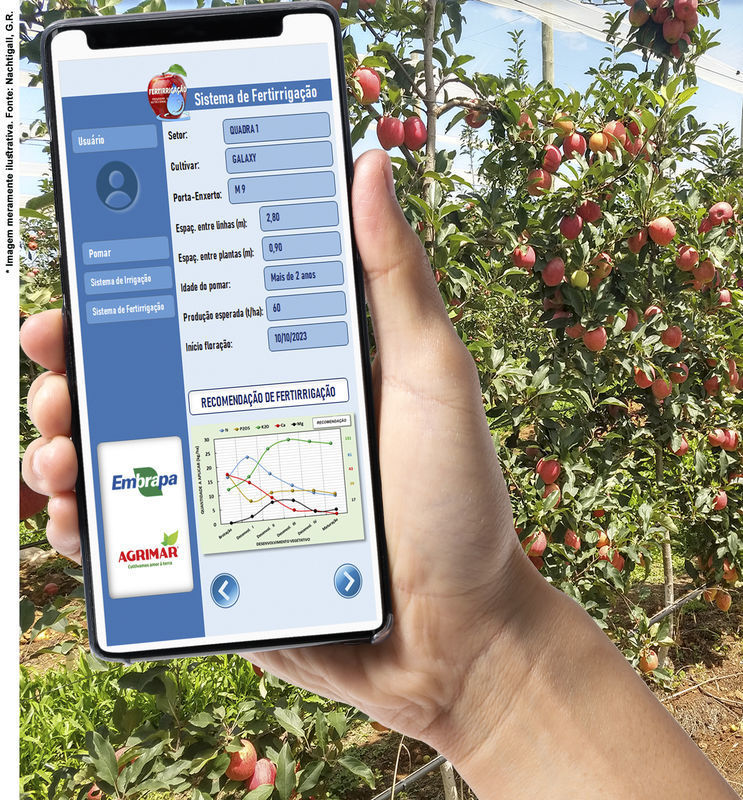 Já o aplicativo para manejo da irrigação fertirrigação auxiliará na tomada de decisão para fazer o manejo de fertirrigação (quando e quanto aplicar de fertilizantes) em cultivos de macieiras, através do fornecimento de informações de quantidades adequadas de nutrientes a serem aplicados semanalmente, por seis fases fenológicas, ajustada por cultivar, idade do pomar, densidade de plantio e produtividade esperada. Desta forma, evita-se o uso excessivo de nutrientes, que podem geram danos ao ambiente e maiores custos de produção.
