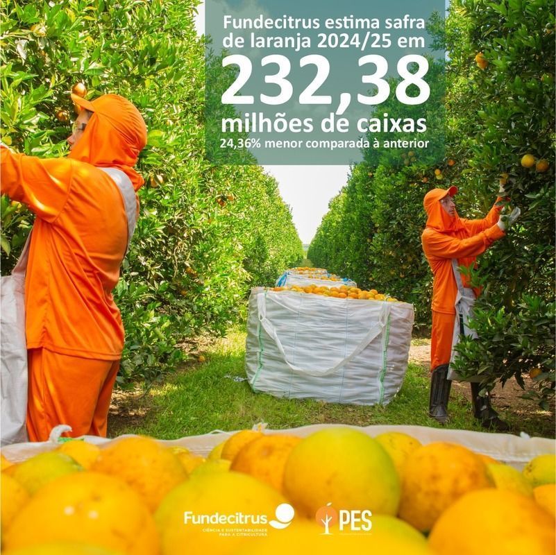 PES 2024 - O Fundecitrus anunciou em sua sede em Araraquara, hoje, 10 de maio, a produção de laranja na temporada 2024/2025 do cinturão citrícola de São Paulo e Triângulo/Sudoeste Mineiro que deverá atingir 232,38 milhões de caixas de 40,8 quilos cada na próxima safra, o que representa uma queda de 24,36% em relação à safra anterior.