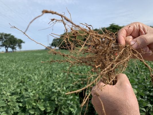 Também foi avaliada a diminuição na população de Heterodera glycines nas raízes e ainda de cistos viáveis no solo. "No geral, houve redução na população de todas as espécies de nematoides (M. javanica, M. incognita, H. glycines e P. brachyurus) no solo e também semelhante nas raízes", completa o engenheiro agrônomo.