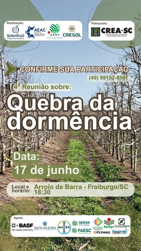 Participe da 4ª Reunião sobre a Quebra de Dormência, promovida pela Scienfruti, AEAC, Sindicato dos Produtores de Fraiburgo e Cresol com patrocínio do CREA SC, BASF, BAYER, SPHAIRA, PLYMAG, INNOVAK, SISTEMA FAESC/SENAR, INNOVAGRO, ACIAF e EPAGRI.