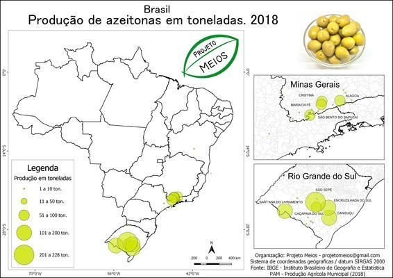 Mapeamento conduzido pelo Projeto Meios1 com dados por municípios, revela o mapa da produção de azeitonas no Brasil em 2018. A cultura da oliveira está presente nas regiões da Serra da Mantiqueira, entre de Minas Gerais, São Paulo e Rio de Janeiro, é uma destacada presença na Região Sul do país.