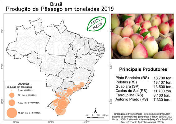 O maior estado produtor é o Rio Grande do Sul, com produção de 110,2 mil toneladas, em 11,8 mil hectares. São Paulo fica em segundo lugar, com 32,9 mil toneladas, em 1,5 mil hectares. Na sequência, os maiores produtores são Santa Catarina, Minas Gerais, Paraná e Espírito Santo. O Rio Grande do Sul principal produtor vem sofrendo baixas de produção há vários anos. De acordo com dados do IBGE, em 2019, o Rio Grande do Sul colheu 110.205 toneladas da fruta, 60% de toda a produção brasileira no ano. (183.132 toneladas). Já em 2018, a produção foi de 146.431 toneladas, quase 25% maior. Duas décadas atrás, em 2000, os pomares gaúchos produziam mais de 1 milhão de toneladas de pêssego. O pêssego é o fruto obtido do pessegueiro (Prunus persica), nativa da China e do sul da Ásia, tem flores roxas e folhas alternas e serreadas. O pessegueiro é uma árvore de difícil cultivo no Brasil, pois para que tenha um bom crescimento, precisa de temperaturas muito baixas durante o inverno. É uma frutífera exigente em tratos culturais intensivos e em cultivares adaptados ao clima local. Em São Paulo, a produção de pêssegos destinase ao consumo in natura, com grande tendência no cultivo de cultivares precoces.