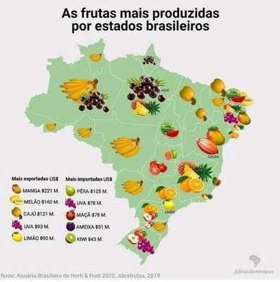 - 3- Uva- Com uma produção de aproximadamente 1,6 milhão de toneladas em 2021, a uva estava na terceira posição no ranking em 2021. O estado do Rio Grande do Sul é o maior produtor de uva no país, sendo responsável por cerca de 54% da produção nacional.