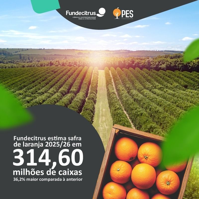 A safra de laranja 2025/26 do cinturão citrícola de São Paulo e Triângulo/Sudoeste Mineiro, principal região produtora de laranja para suco do mundo, é estimada em 314,60 milhões de caixas (40,8 kg), de acordo com o anúncio feito pelo Fundecitrus nesta sexta-feira (9/5). O crescimento é de 36,2 % em comparação à safra anterior, que fechou com 230,87 milhões de caixas produzidas, o que representa um aumento de 4,8% em relação à média das dez últimas safras. A perspectiva de uma safra maior é atribuída principalmente ao maior número de frutos por árvore, resultante do clima favorável à segunda florada e do melhor manejo dos pomares, e ao aumento da quantidade de árvores produtivas no parque citrícola identificadas no novo censo.