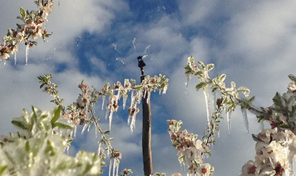 O outro tipo de irrigação é o supraarbóreo, mas que segue o mesmo princípio de funcionamento. Nesse caso, os sensores estão localizados nas lavouras e acionam os aspersores para produzir uma espécie de névoa que produz o efeito mencionado.