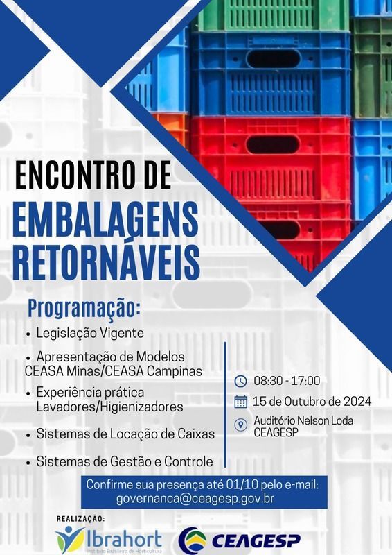 Em 15/10 acontece, no Entreposto da CEAGESP em São Paulo, na Vila Leopoldina, o "Encontro de Embalagens Retornáveis" realizado pela Companhia em parceria com o Instituto Brasileiro de Horticultura (Ibrahort).