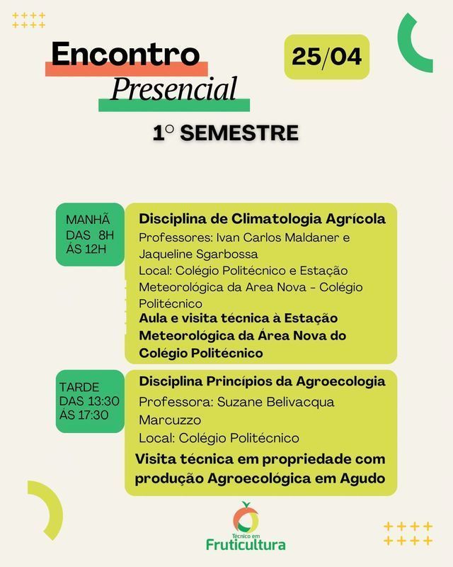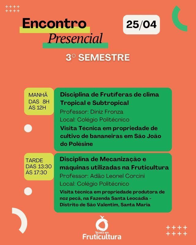 Acompanhe mais ações de nosso Curso no site e em nossas redes sociais: Facebook | Instagram | YouTube - Dúvidas: Sobre o processo seletivo: [email protected] - Informações referentes aos programas, turnos e aulas dos cursos: [email protected] ou [email protected] - Sobre o Curso: [email protected] - Acompanhe mais ações do Curso Técnico em Fruticultura EAD no site e nas redes sociais: Facebook - nstagram - YouTube - Fonte: https://ufsm.br/r-582-462