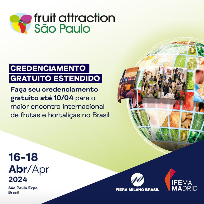 A Fruit Attraction São Paulo prorrogou para o dia 10 de abril o credenciamento gratuito da primeira edição brasileira da feira de frutas e vegetais, que ocorre entre os dias 16 e 18 de abril, na São Paulo Expo. Realizada pela Ifema Madrid em parceria com a Fiera Milano Brasil, o evento tem expectativa de alavancar ainda mais as exportações dos produtos no país, que atingiram recorde histórico de faturamento em 2023.