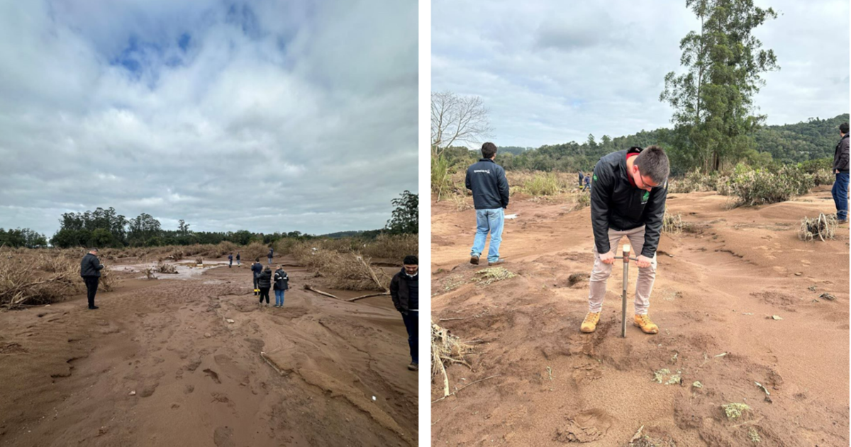 Equipes da UFRGS, Seapi e Emater-RS/Ascar fizeram a coleta de amostras de solo em um pomar atingido pela enchente. As amostras foram coletadas numa área em que houve deposição de três metros de sedimentos mais grosseiros pela enchente; em outra onde havia uma camada de alguns centímetros de sedimentos mais finos; e do subsolo original do pomar, localizado abaixo desses sedimentos. Os solos foram analisados conforme sua composição granulométrica (tipos e tamanhos de partículas), sua acidez, teor de matéria orgânica e concentração de nutrientes.
