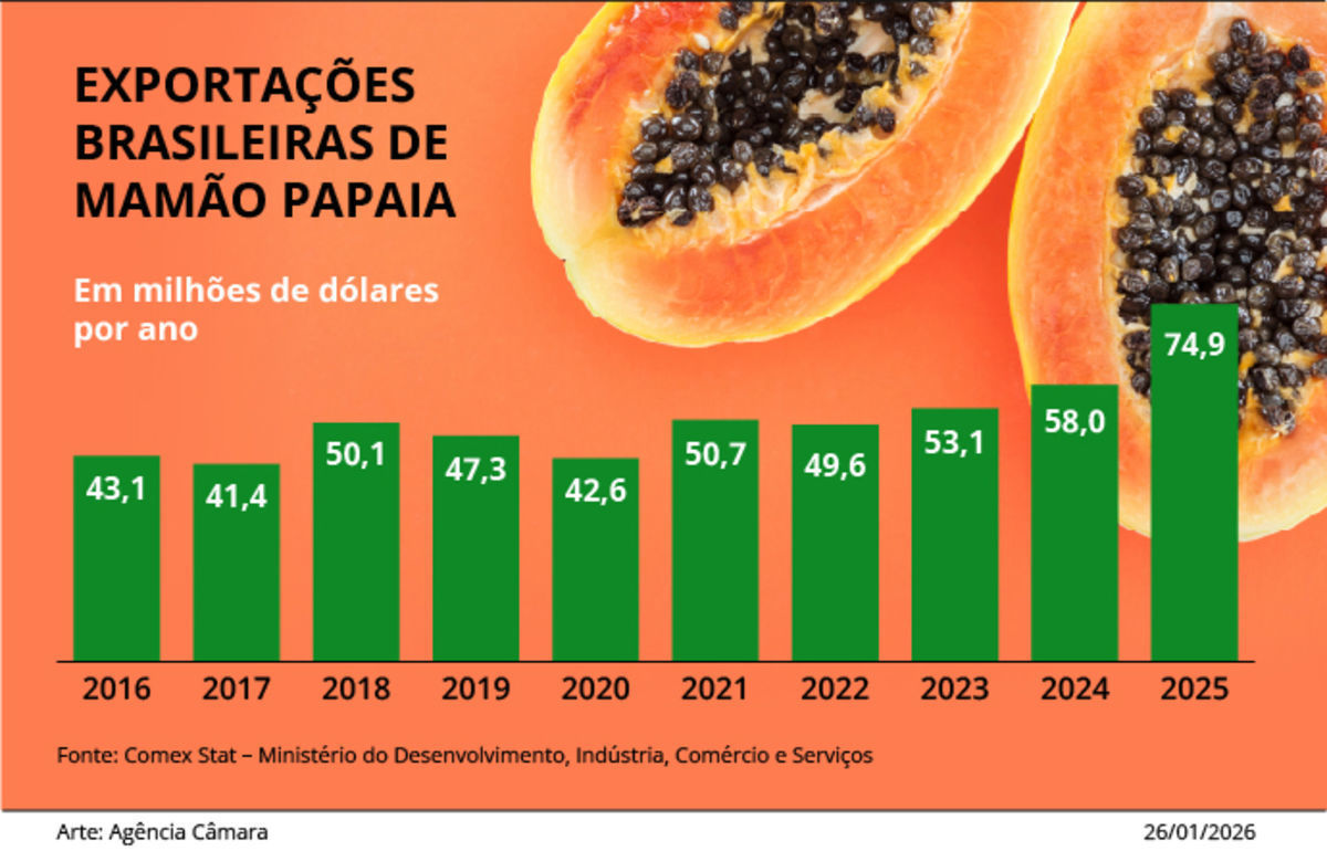 Tarifaço dos EUA - O mamão capixaba esteve entre os produtos impactados pelo aumento tarifário imposto pelos Estados Unidos. Em 2024, cerca de 11% das exportações da fruta tiveram como destino o mercado norte-americano, com o embarque de 2,2 mil toneladas, que geraram aproximadamente US$ 3 milhões em divisas.